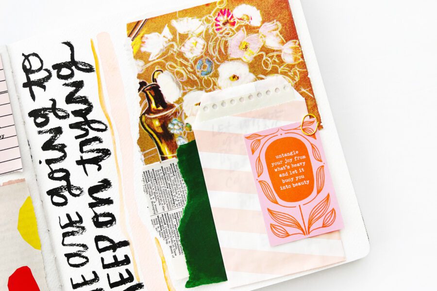 Katie and I are trying to plot out how to achieve the best results with her fantastic watercolor work and my collage. Thinking about how to accommodate our individual skillz is a challenge. We finally decided today that we would each work on parts of the books we made, swap, work on them, and then swap again to finish up. She’s going to end up with this one and I’m going to end up with the one she’s made. Hopefully, the end results will be lots of layered yumminess. I’m excited to see where this is going and it’s given us tons of opportunities to chat! Win-Win!