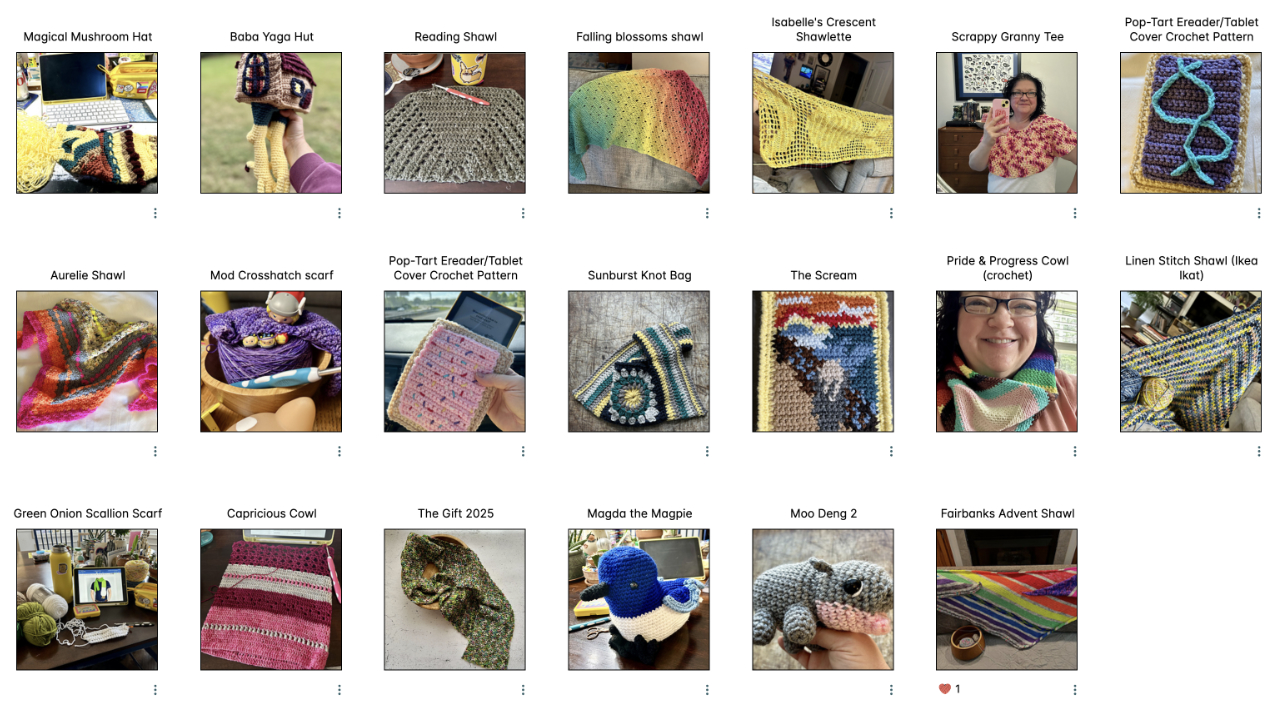 My impulse recently has been to crochet whimsical things. I’ve recently finished Baba Yaga’s Hut (pattern by Megan Lapp) I made pop tart covers for mine and my partner’s kindles recently. I made a mug rug but it’s The Scream. Then I made a Green Onion scarf earlier this year. I like making silly things that bring smiles.