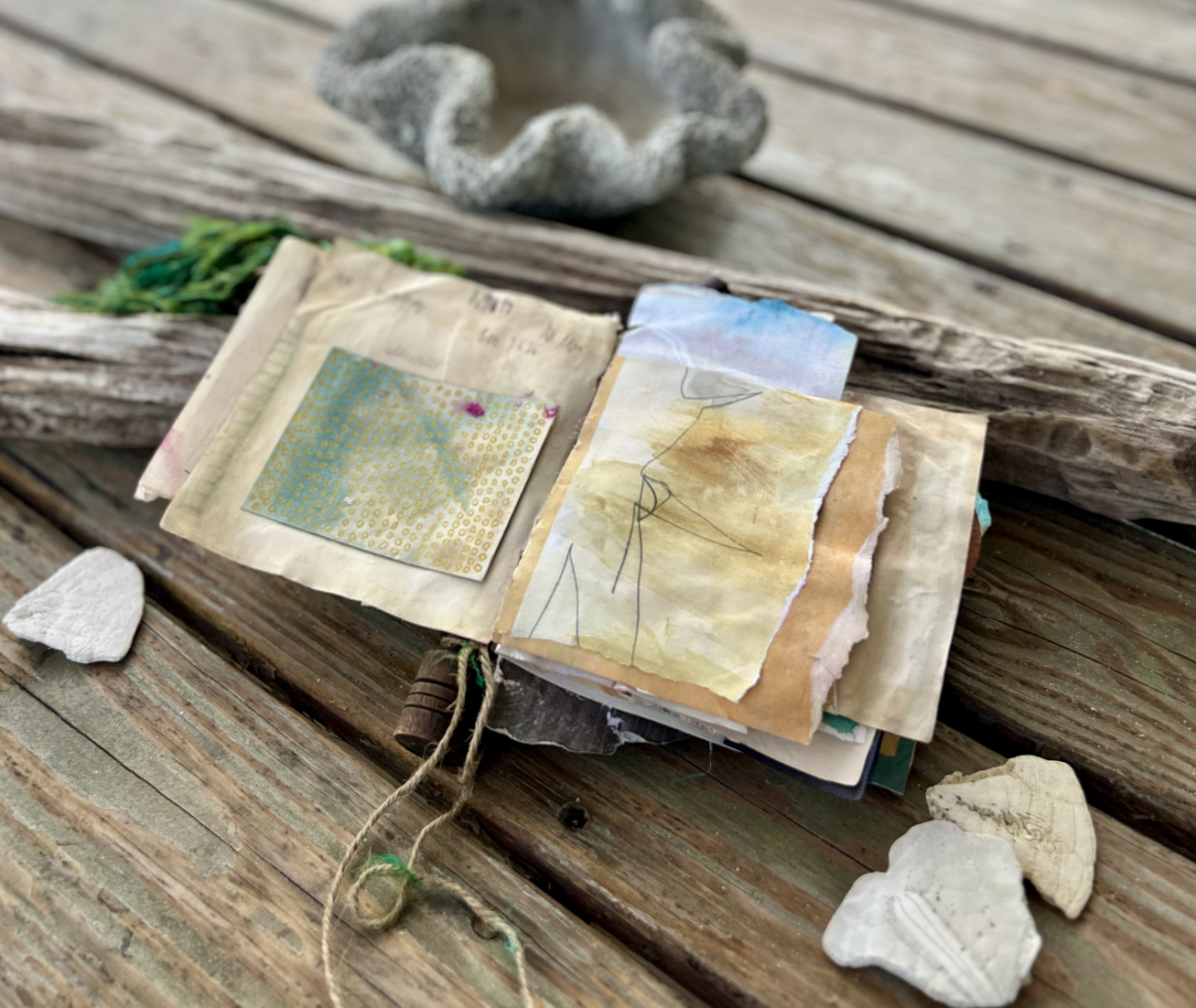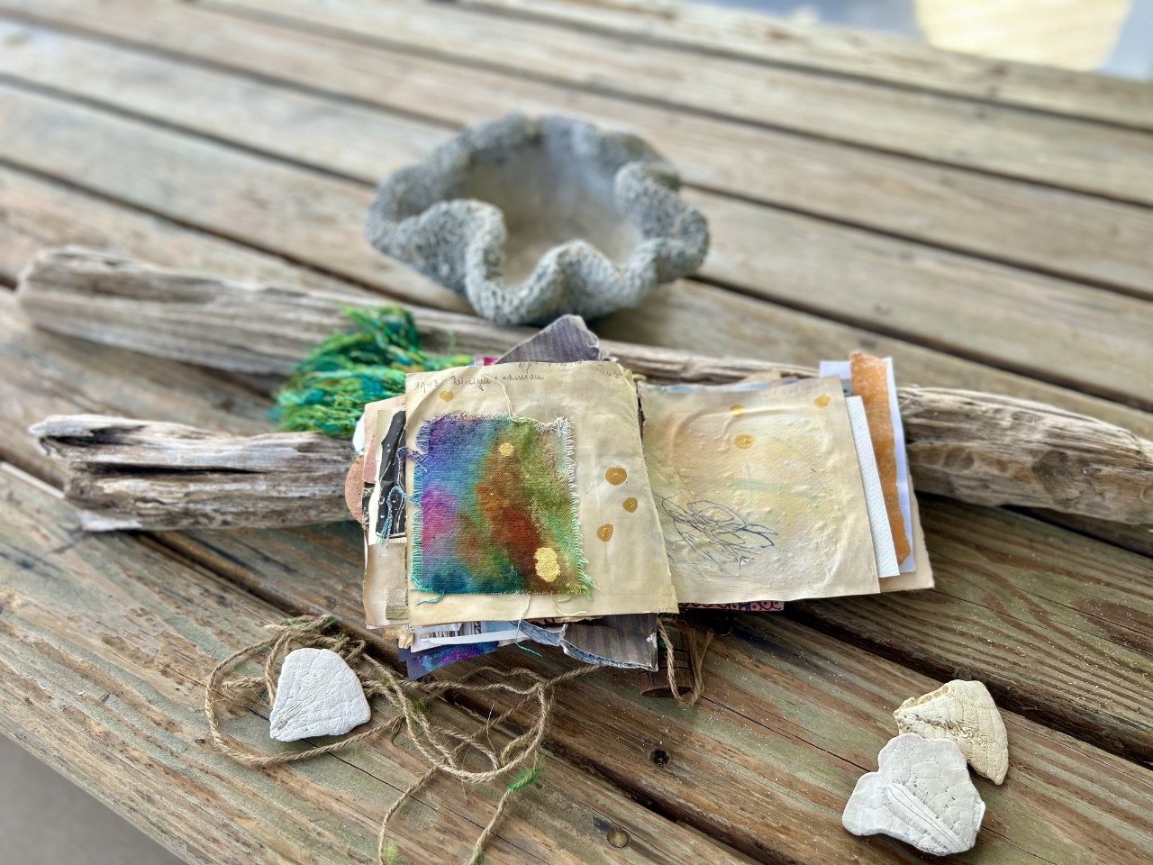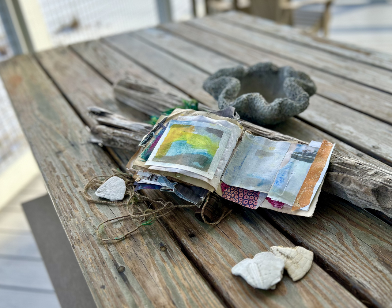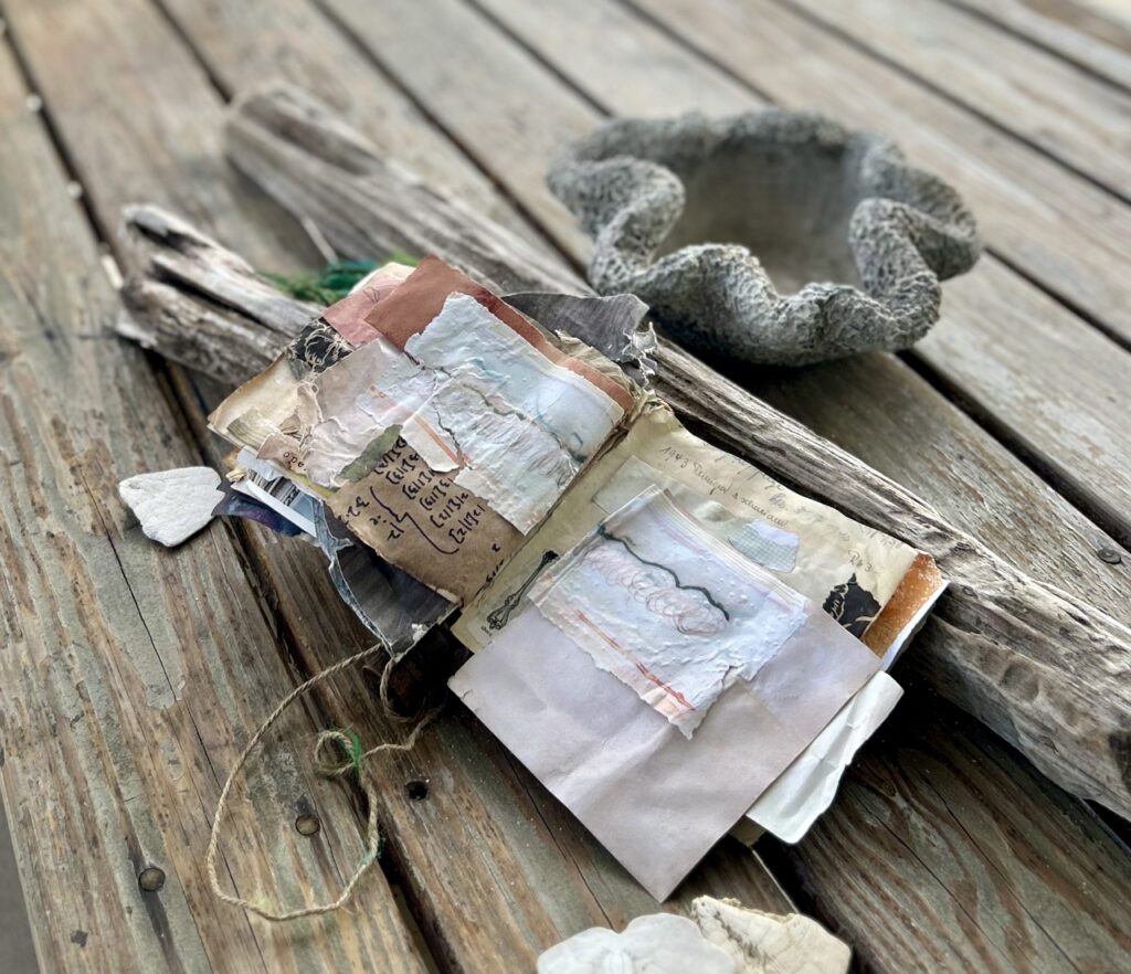 Taking it to the beach Thanksgiving week and filming was fun. I ended up tying the book to my ankle so I could film it and wouldn’t get away from me while it was sloshing around in the ocean. (Watch for the brown twine while it’s in the water. The other end is me!) I liked filming and seeing what worked when I put it together afterward.