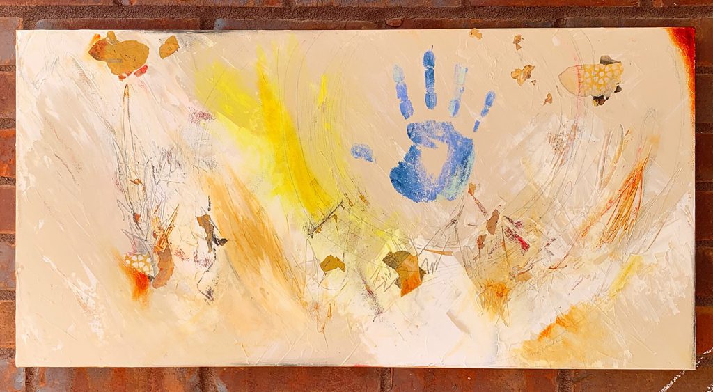 This work is near and dear to my heart and has hung in my living room since I made it. I look at it every day and the hand print reminds me of all the people before me who didn’t stifle their creative impulses and instead chose to make something and share it.