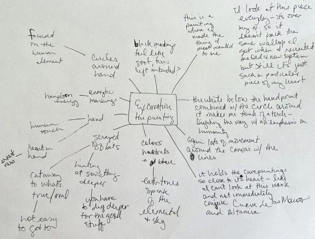 I’ve talked about mind mapping before. This process was slightly different than any I discuss in that post though because I have been looking at an art piece I made and using the mind map to capture things I liked about the piece, thoughts about the work now, and notes on the process of making it. I wanted to do that for a few pieces so I could find commonalities and draw some threads together for my grant essay.