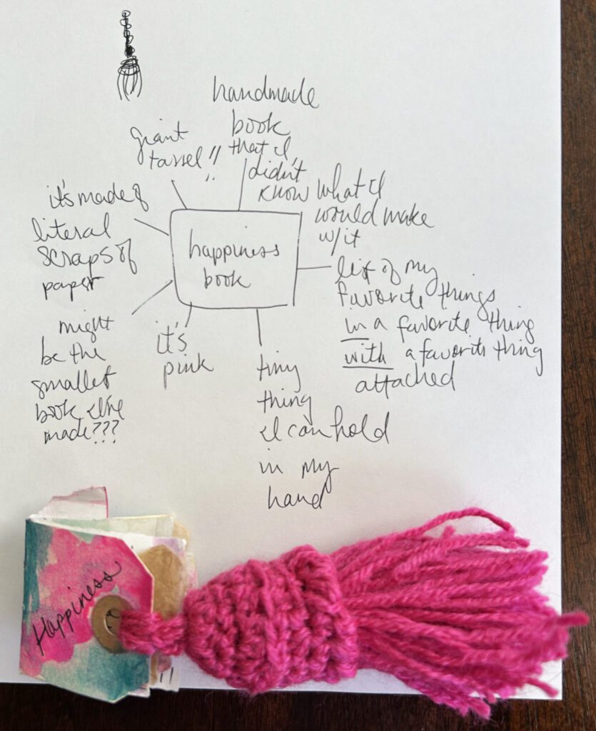 I had this tiny blank book sitting on my desk for months. And then during a journaling session, I made a list of things that made me happy. It was destiny that I transfer the list of happy things to the tiny book that also makes me happy. Tassels aren’t listed inside the book but they make me very happy too. And attaching a tassel that’s twice the size of the book made me so giddy I had to do it immediately. I fully recognize that this is a ridiculous idea and project but it’s also absolutely perfect.