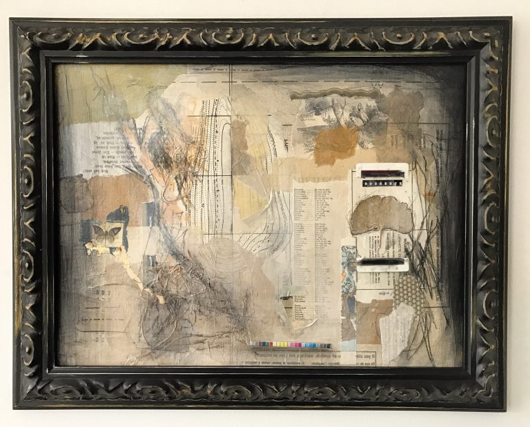 “Monochrome for Jean” (found paper, thread, pieces from a disassembled photo slide, a ginkgo leaf, acrylic paint, graphite, & ink) 12×16″ Framed work on canvas, no glass. For Sale: $175…