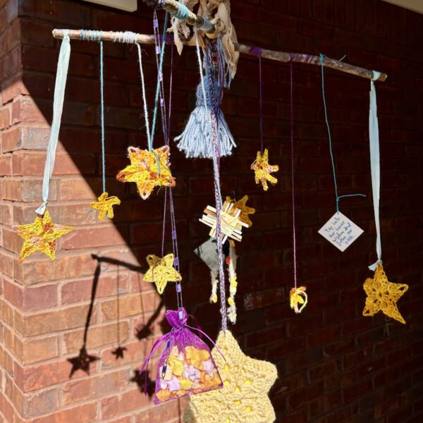 This piece is made of paper, string, yarn, copper wire, and a Tulip Poplar stick from my backyard. After construction, I took the finished piece to Big Spring Park and dipped it in the pool at the mouth of the spring.