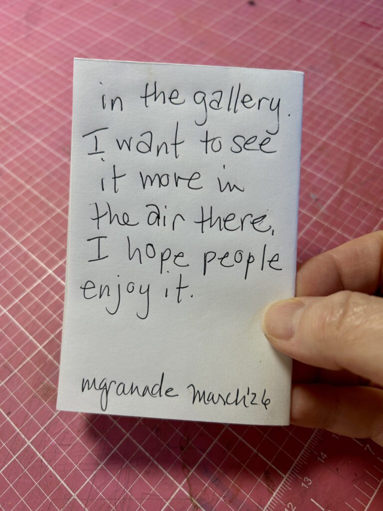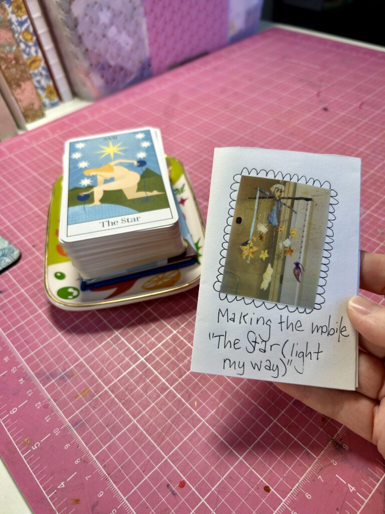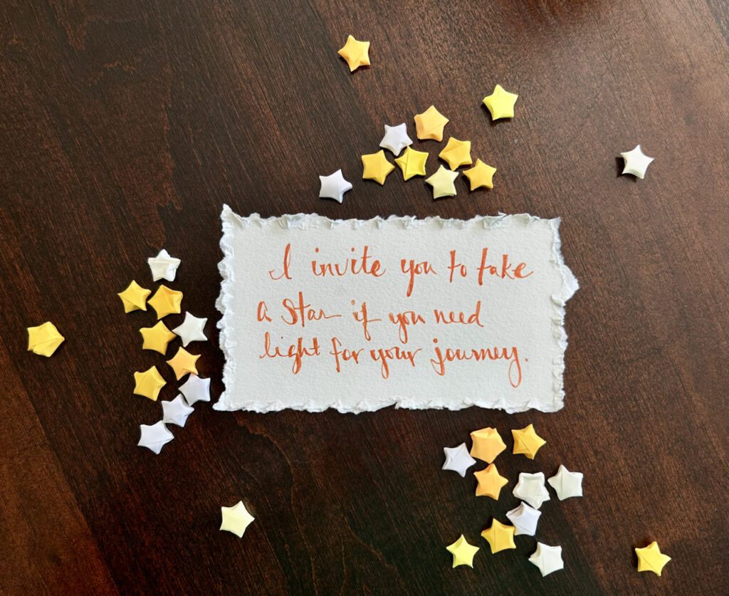 In my current body of work, I am exploring the tarot and how the cards’ themes intersect with my life and creativity. The Star tarot card is about inspiration and guidance. In culture and myths stars are symbols of wishes and hope. Stars exist outside of borders but are available to all of us. They guide and enchant us. In this piece, I invite the viewer to think about what path they are on and what they need for the journey. The viewer is invited to take a star from the floor as a reminder that they can access the power of the stars at any time.
