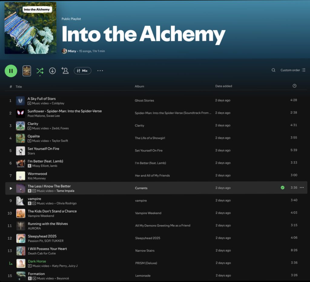 At the beginning of making this piece I made myself a Spotify playlist because I kept singing the Coldplay song “A sky full of stars” to myself while I was working. I’ve been listening to it kinda a lot while I’m working and my only complaint is that it’s not enough songs. It’s kinda witchy, I guess? I dunno. It’s just this current work’s soundtrack.