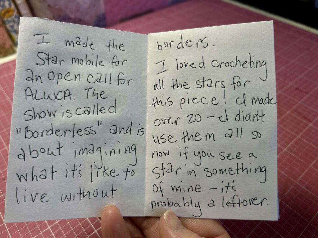 Making the bits to go on this was definitely the most fun part of this project. I got to make all kinds of stars and all kinds of other little artifacts. I crocheted about 20 stars of various kinds and sizes (I didn’t end up using them all but I didn’t know what sizes or colors I’d need so I just kept making them). There’s two little fabric bags of stars: one closed up for later and one open and pouring stars out onto the ground. I wrote myself a little note to have in the project basket which I ended up hanging from the mobile. One side says: What would it look like to believe again? and the other side says: Tap into our inner wisdom and follow our path.