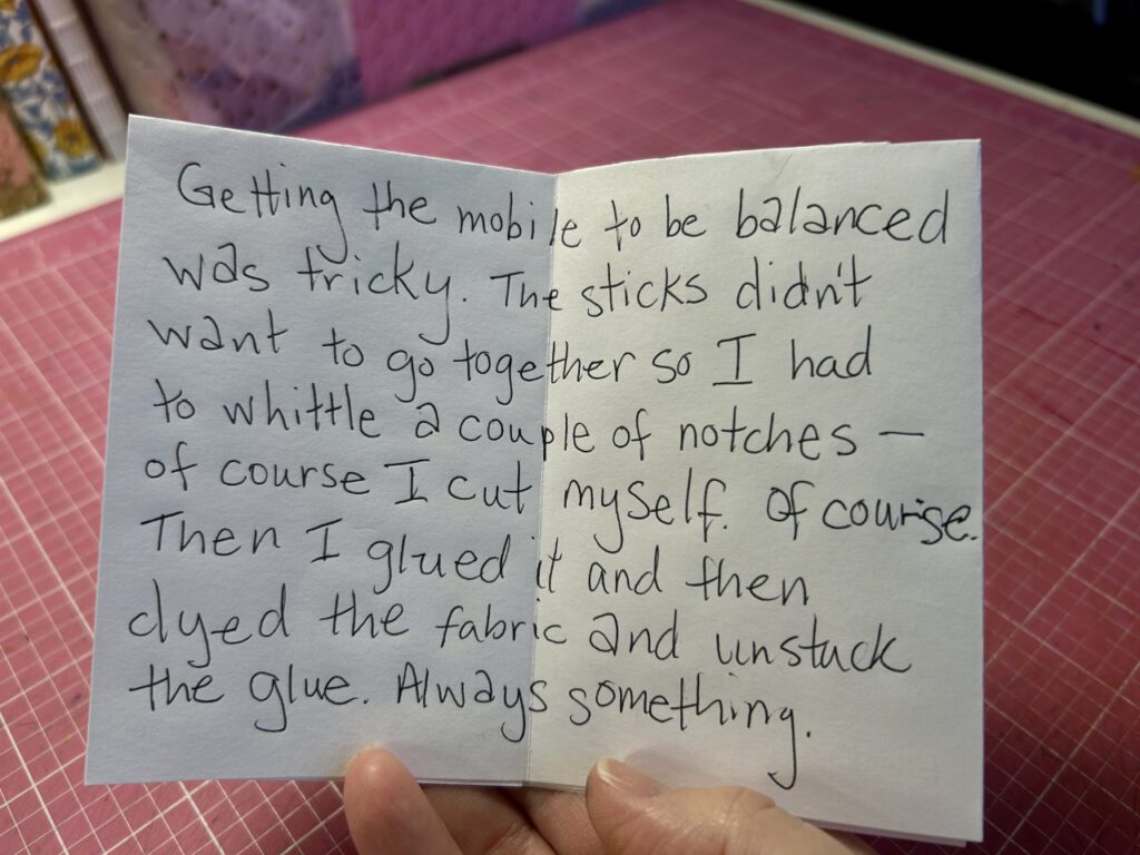 When I decided to make a mobile for this open call I didn’t know what I was getting myself into. Remembering the mobile that my children had hanging over their cribs made me think this would be…not a big deal to pull off.