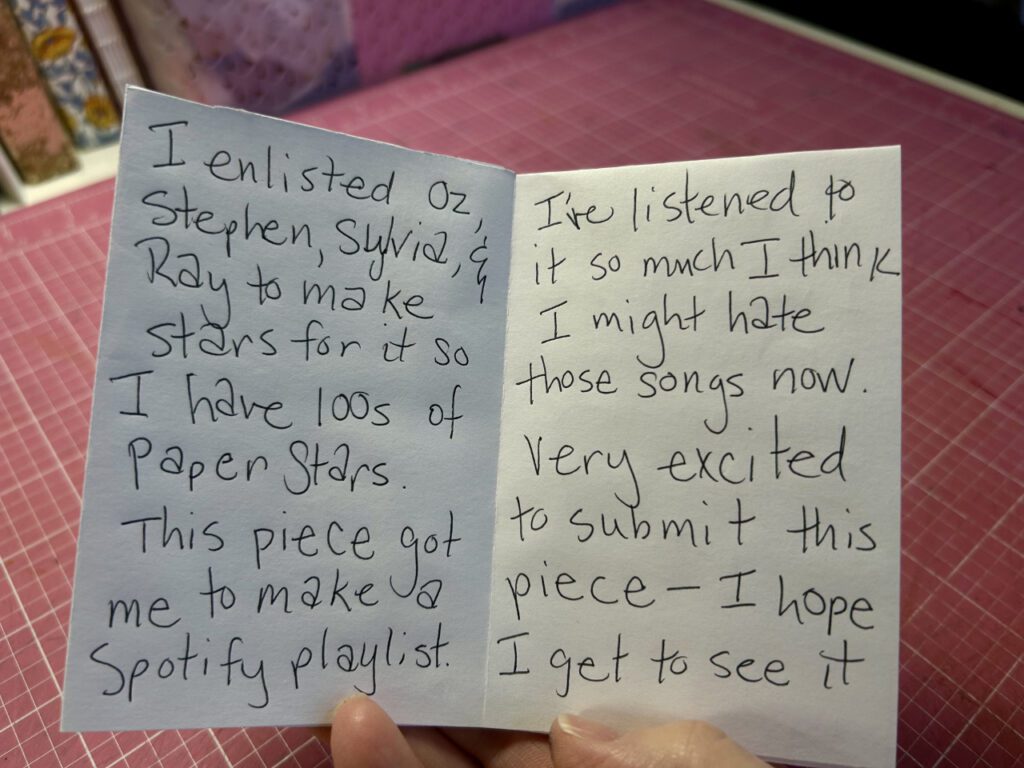 One of the ways I’m documenting what I make this year is to create a quick zine about the process. I don’t want this step to get bogged down so this is the quickest and the dirtiest. Just a sheet of drawing paper turned into a one page zine where I record things that were meaningful to me during the making process. It’s a way to stop and savor what I’ve done. Plus record it like social media doesn’t exist because well, it mostly doesn’t for me anymore. Flip through the pages below!