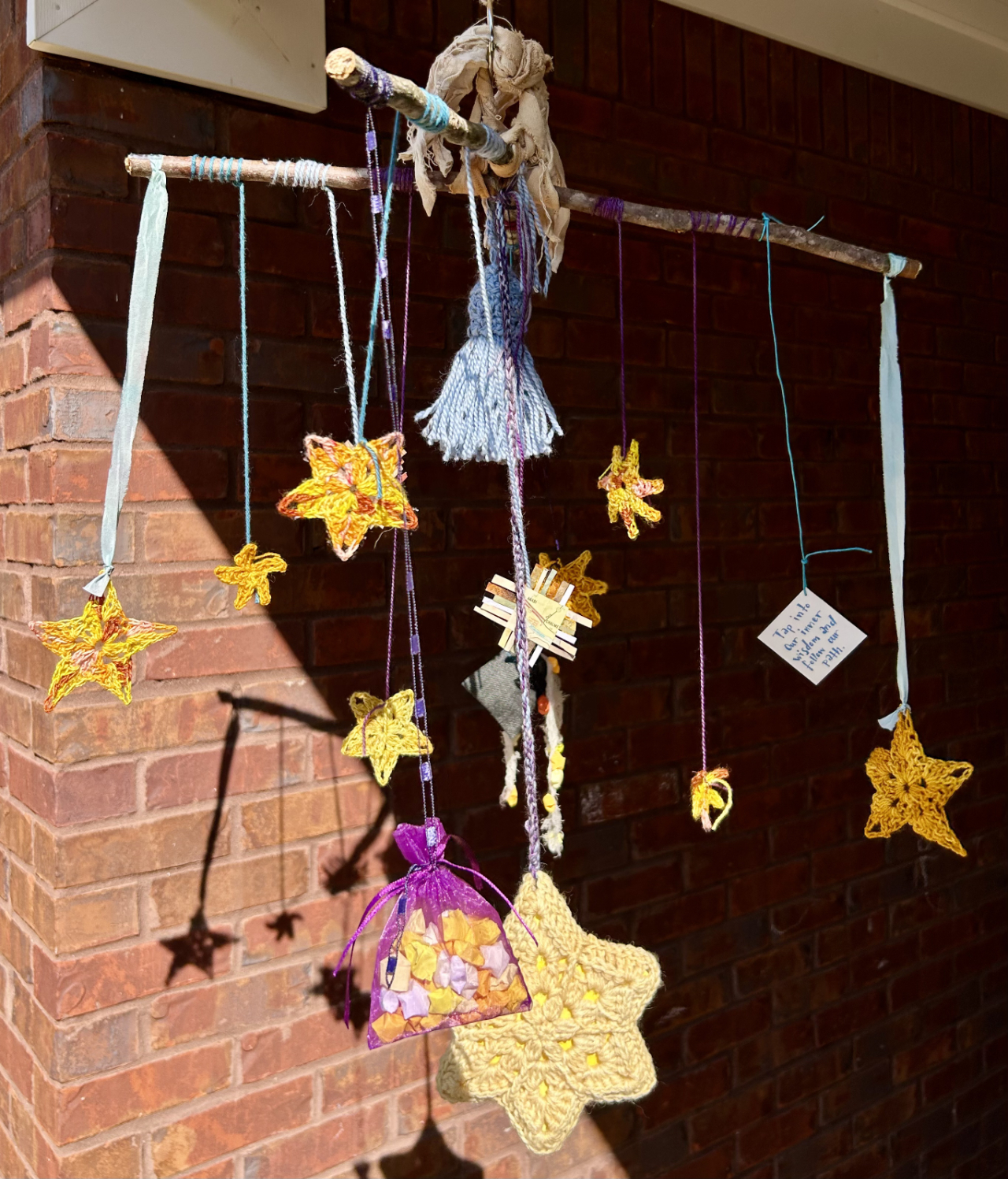 Making the bits to go on this was definitely the most fun part of this project. I got to make all kinds of stars and all kinds of other little artifacts. I crocheted about 20 stars of various kinds and sizes (I didn’t end up using them all but I didn’t know what sizes or colors I’d need so I just kept making them). There’s two little fabric bags of stars: one closed up for later and one open and pouring stars out onto the ground. I wrote myself a little note to have in the project basket which I ended up hanging from the mobile. One side says: What would it look like to believe again? and the other side says: Tap into our inner wisdom and follow our path.